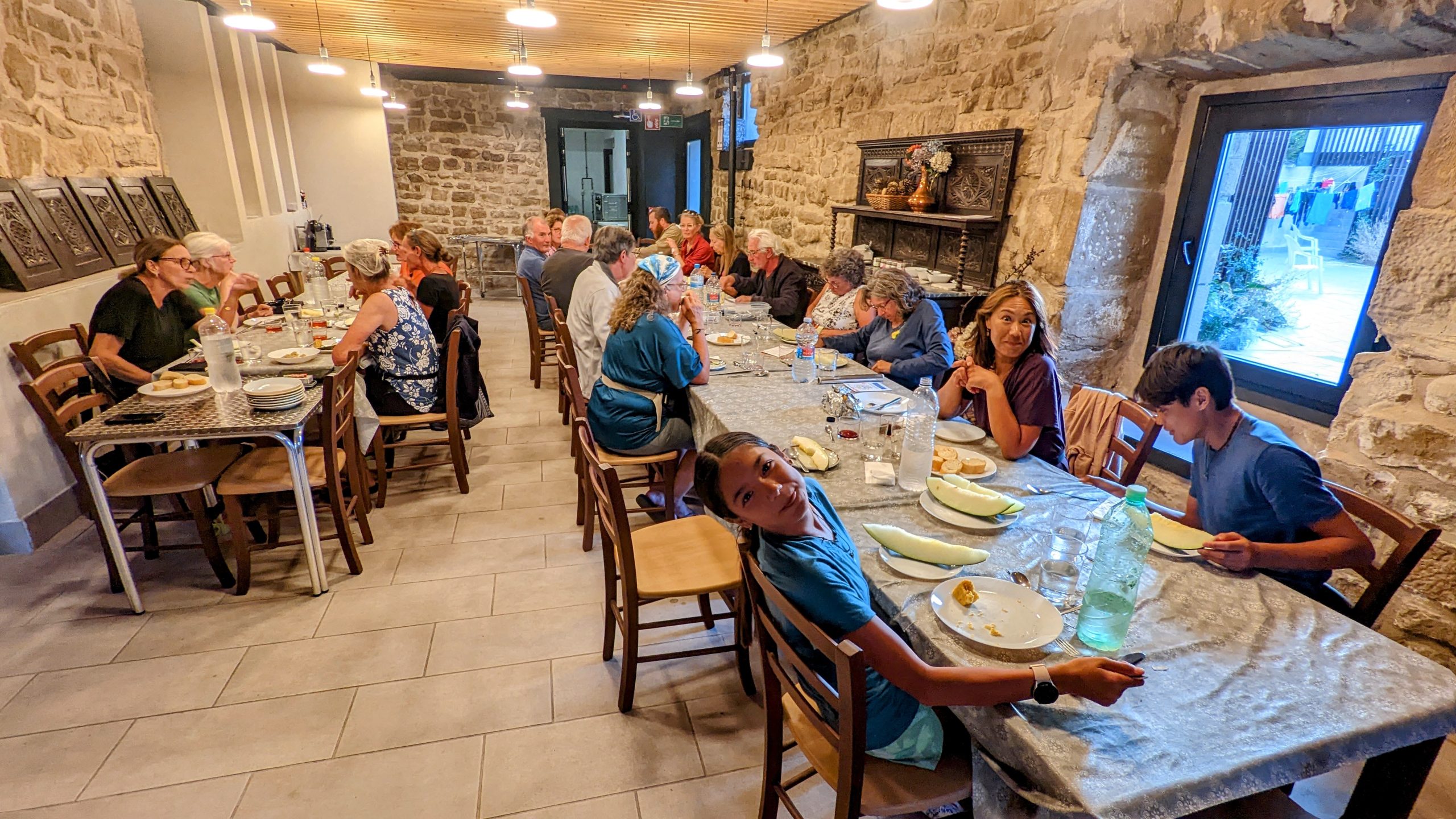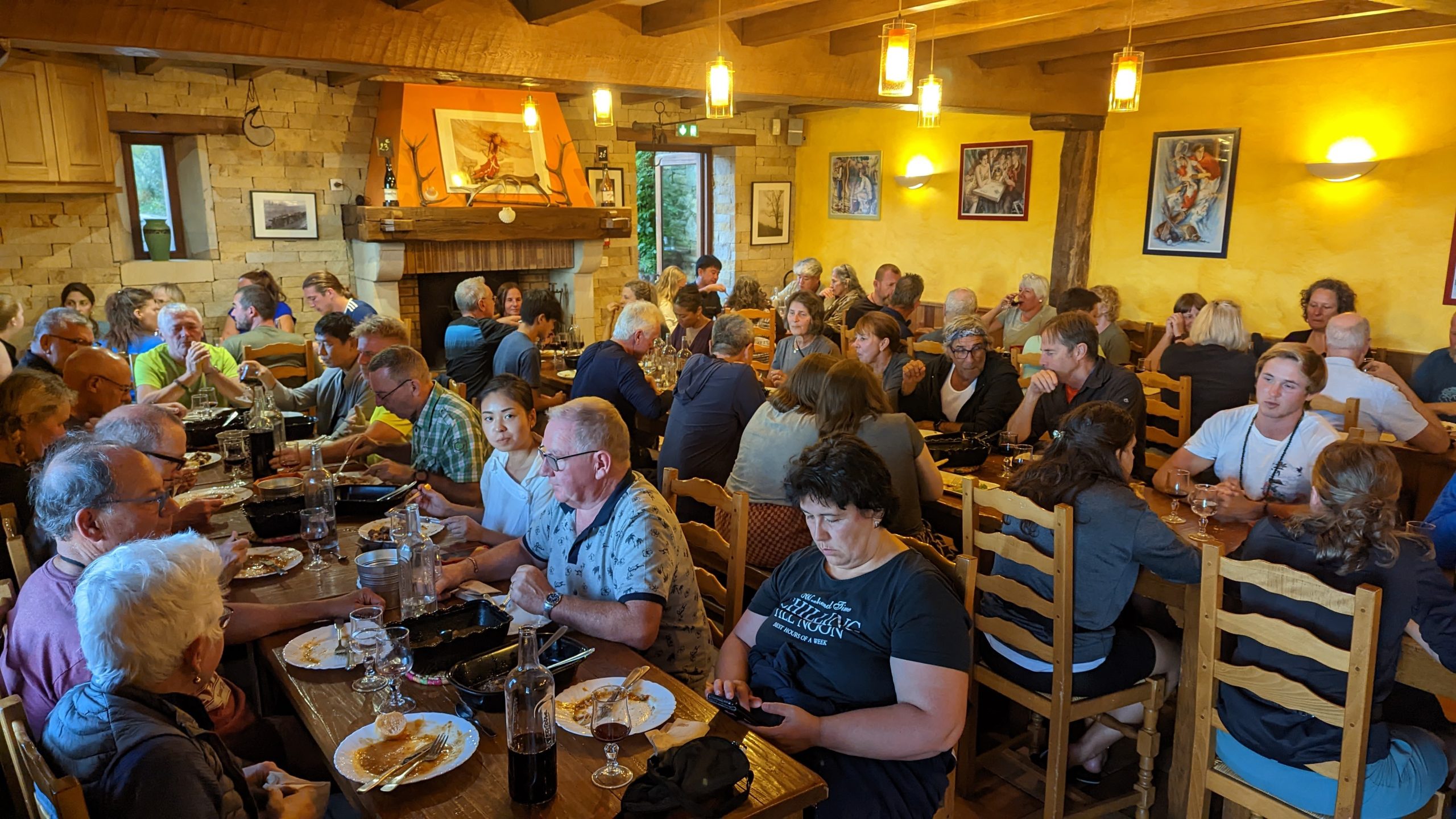 L'Albergue de Roncevaux qui à une capacité d'environ 240 pèlerins, a du ouvrir les sous-sols pour accueillir l’ excédent de marcheurs. Toute personne qui n'avait pas de lit s'est vu offrir une navette vers un autre village qui avait de la place. Heureusement, pour nous, nous avions réservé 2 jours avant le départ. Cette Albergue comprenait un repas avec du vin au restaurant d'à côté. Nous avons dîné avec un Américain, un Finlandais et un Français - cela ressemblerait presque au début d'une blague 🙂