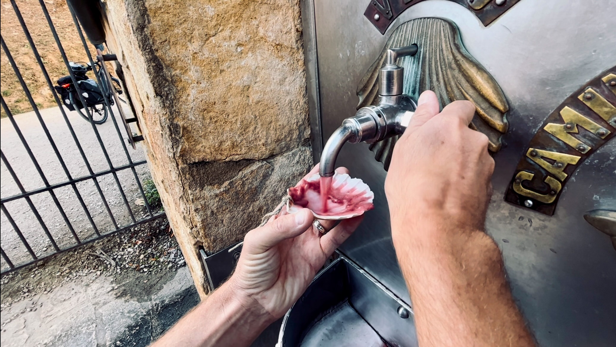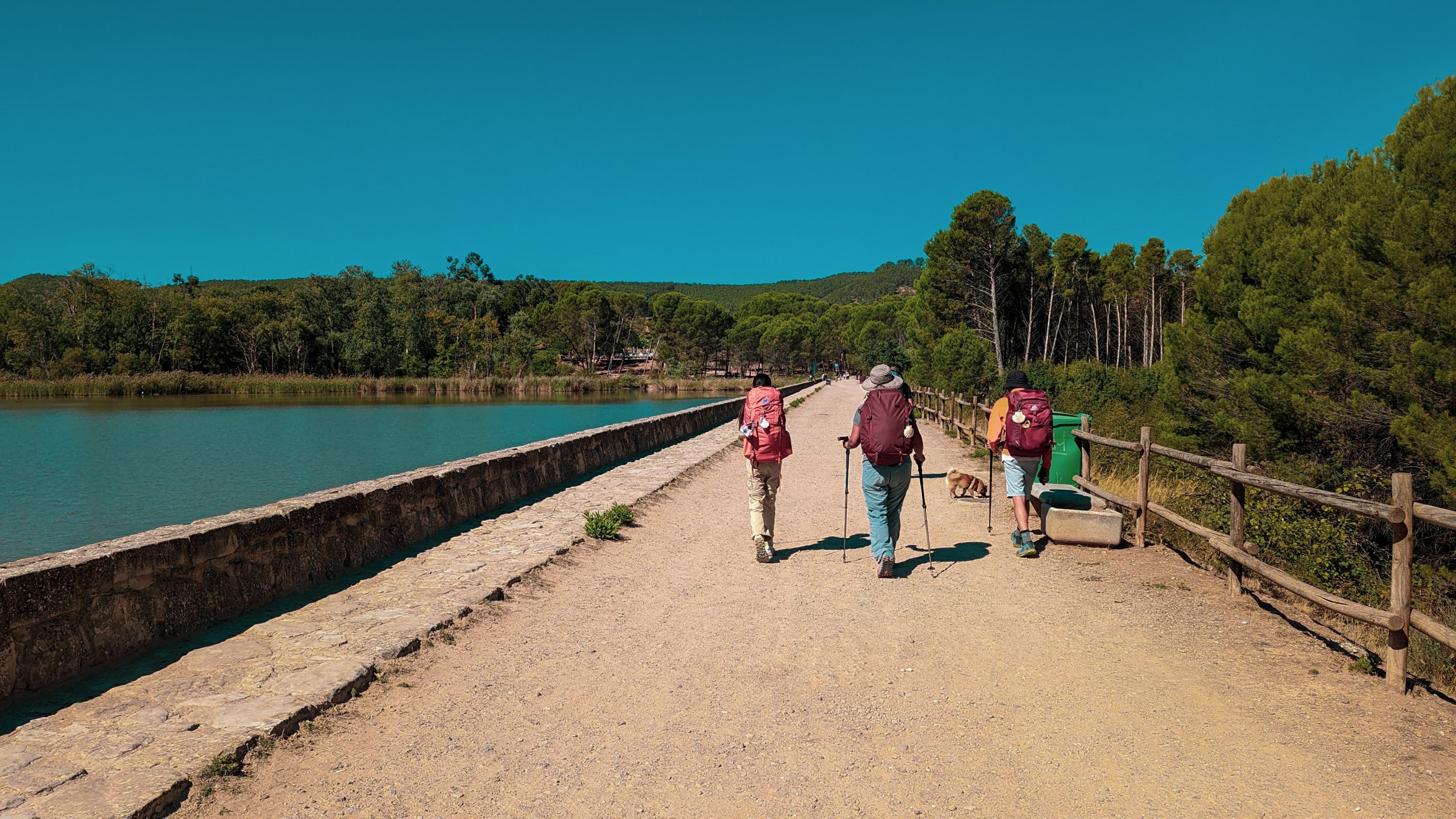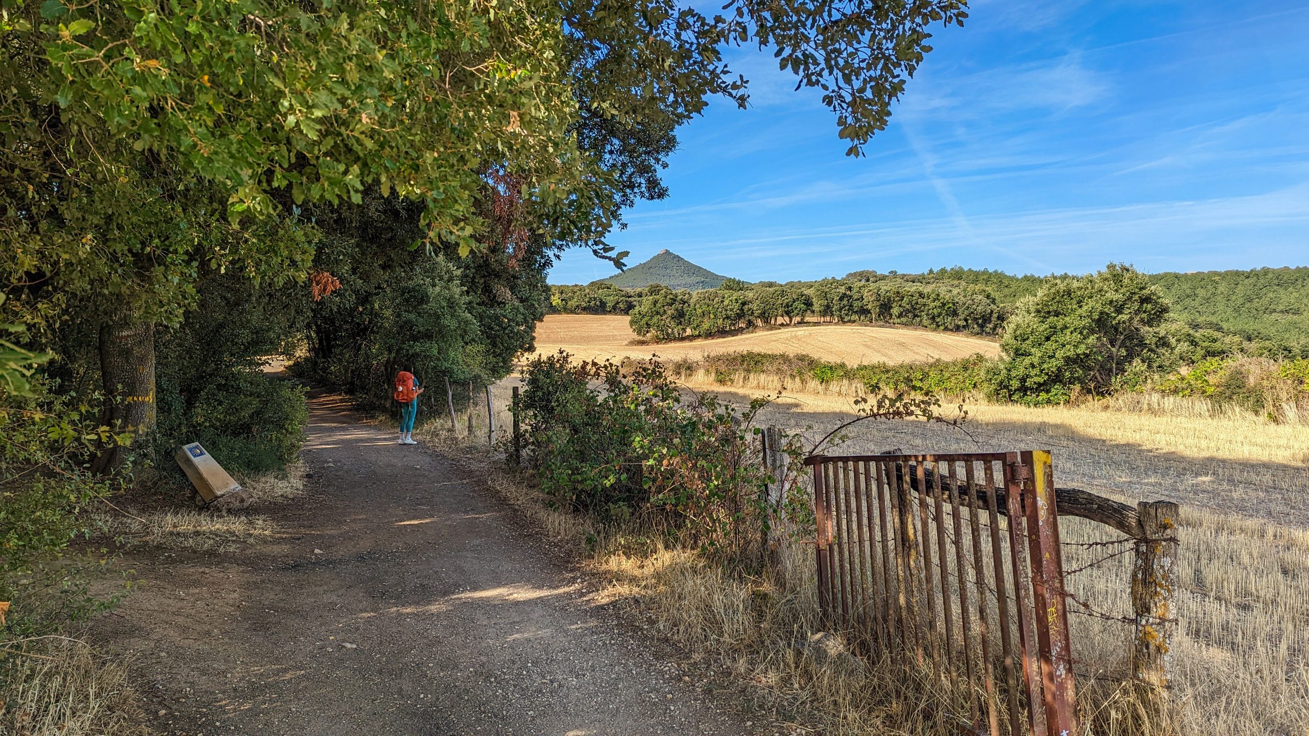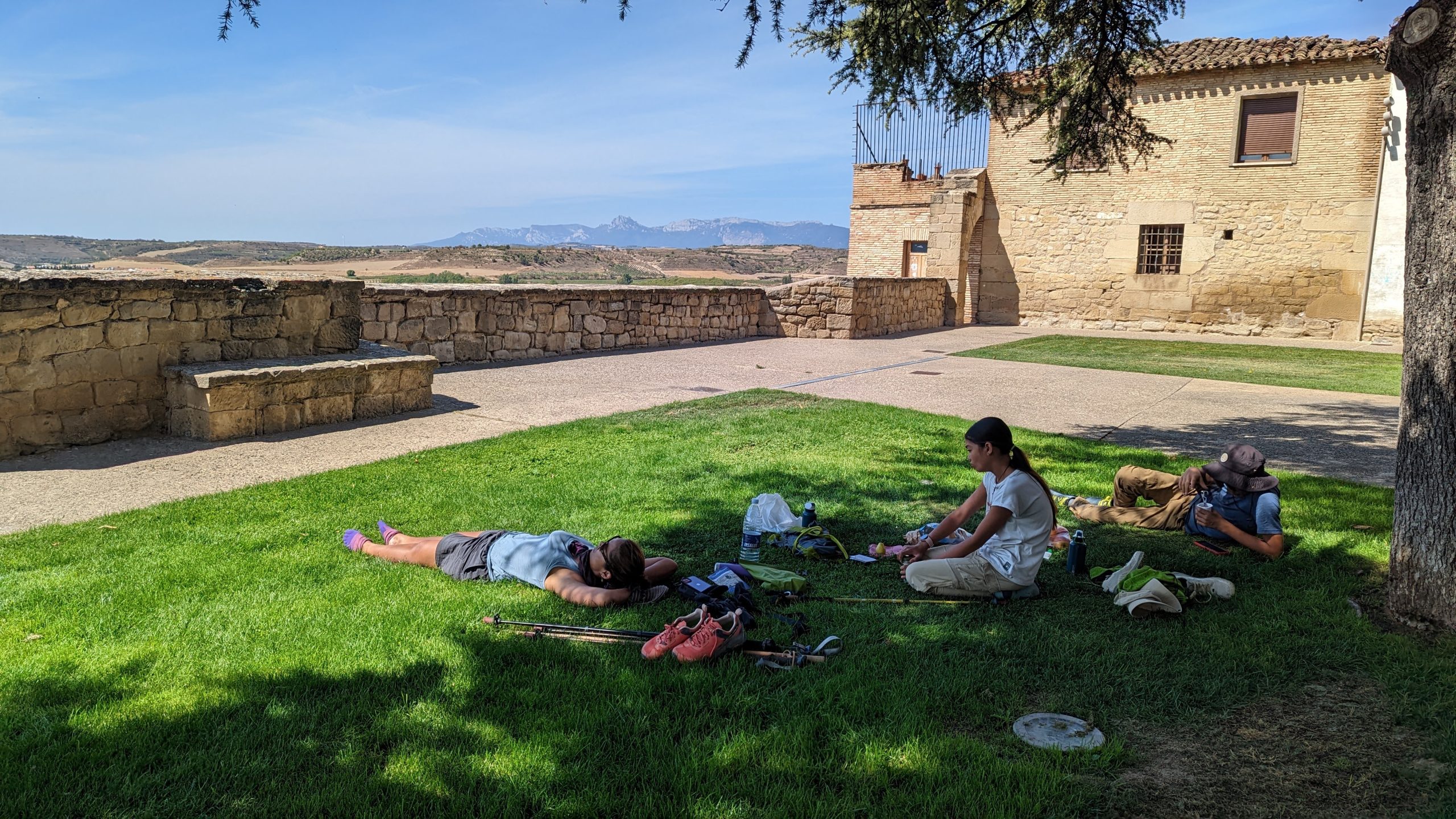 Nos bâtons de randonnée étaient extrêmement utiles. Ils nous ont aidé à nous propulser vers l'avant à fin d’équilibrer le centre de gravité. Le chemin offrait très peu d'ombre à l'exception d'une collection d'arbres à l’écart de la route. Les pèlerins s’y rassemblent pour obtenir un répit du soleil de l'après-midi. Nous nous sommes allongés sur les rochers, la terre sèche et l'herbe pour écouter la brise . Nous avons mangé nos pommes, nos oranges et nos gaufrettes au chocolat fondu. Nous nous sommes contentés d'une brève collation.