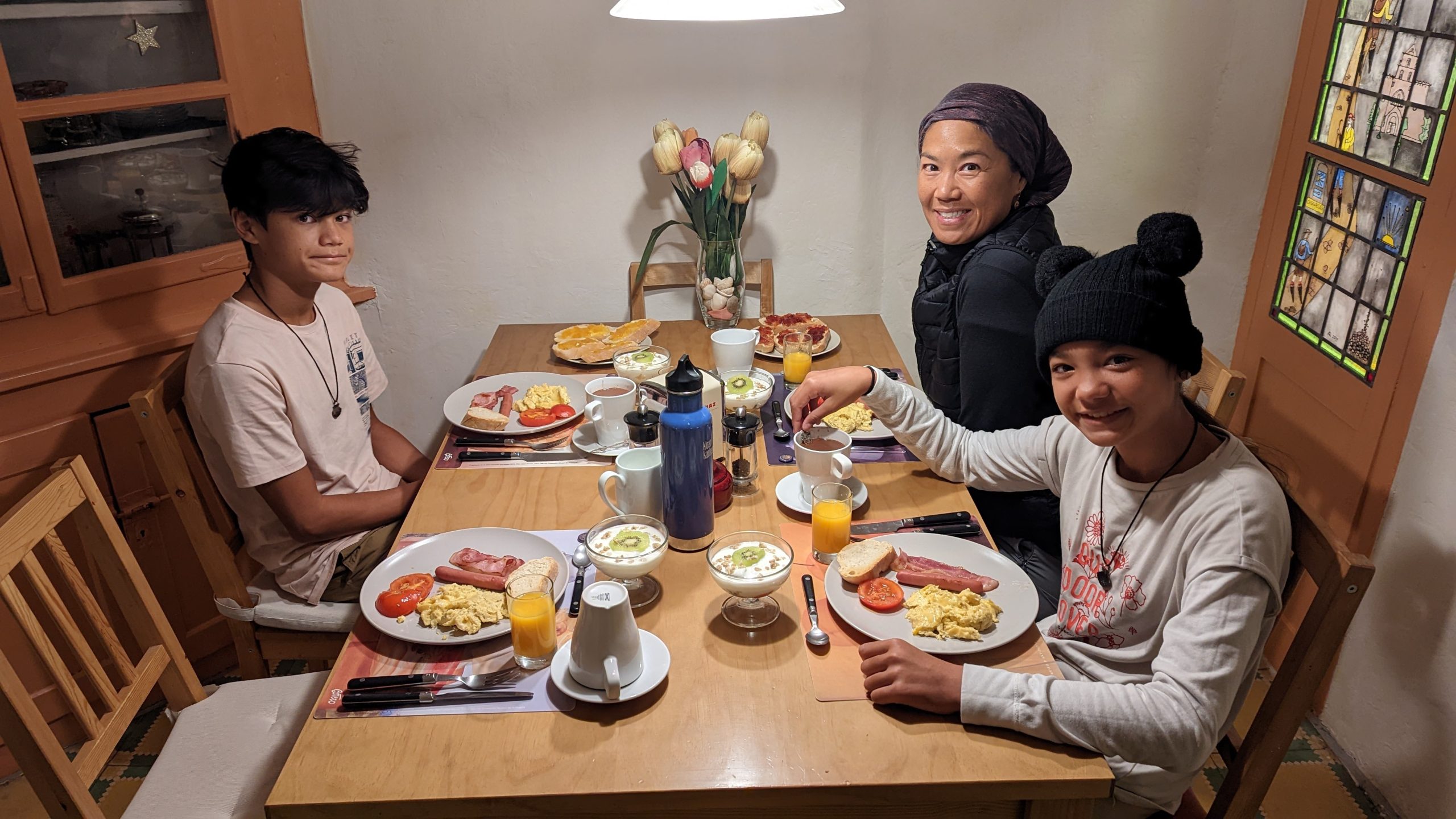Enfin, nous avons été pris en charge par notre hôte sur la distance de 2 km jusqu'à la pension. Une chambre avec salle de bain privée ! De quoi ravir les familles de pèlerins, tout du moins la notre🙂