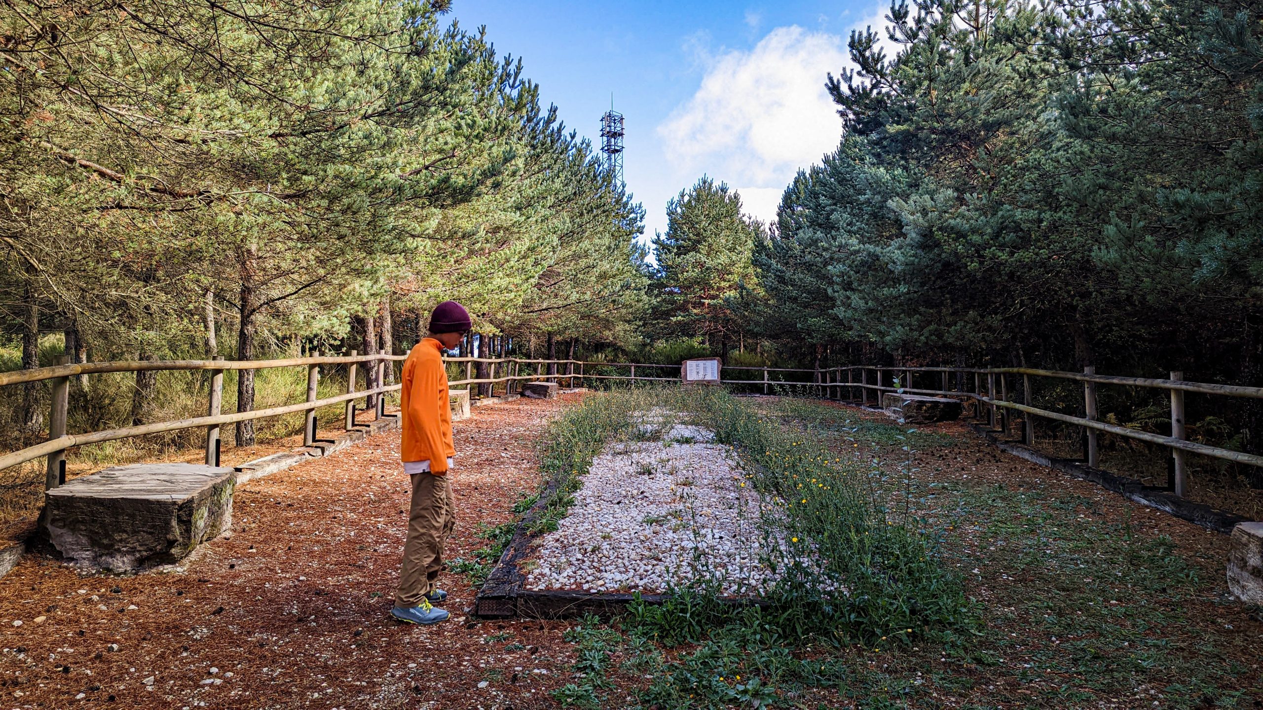 En arrivant au sommet des antennes se trouvent à droite et Rosa notre recent hôte nous a dit de nous diriger à gauche puis vers une croix de 6 mètres et de là nous devrions apercevoir des pèlerins.