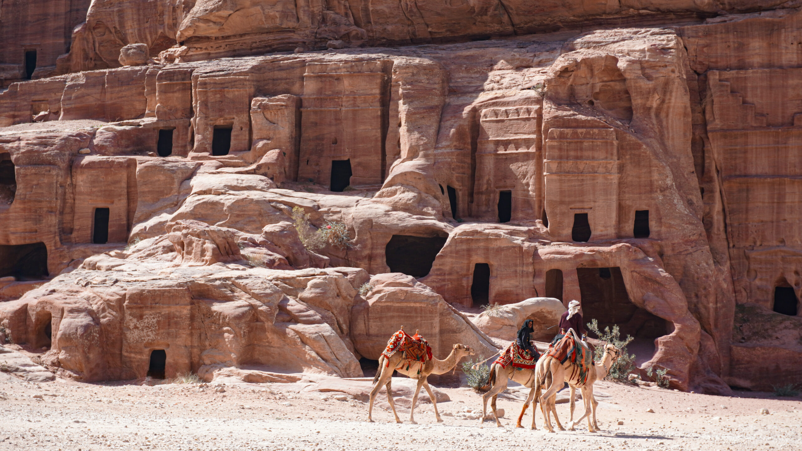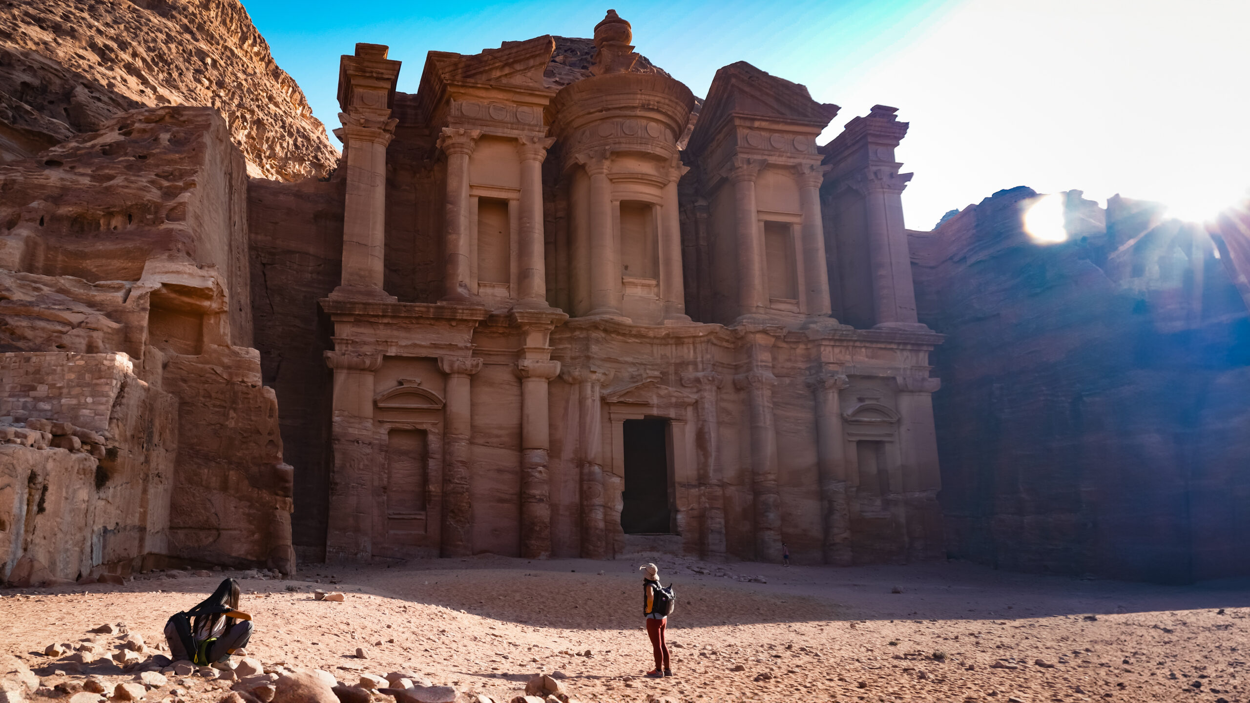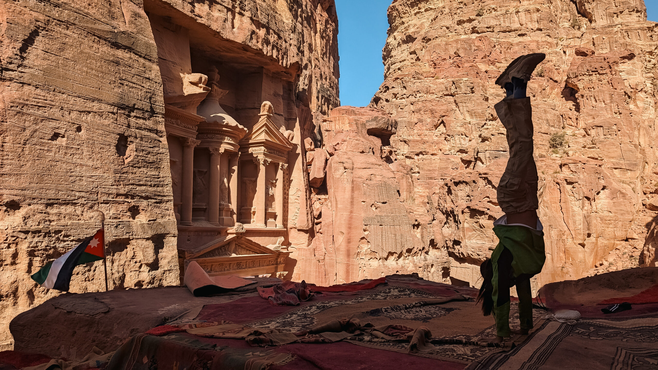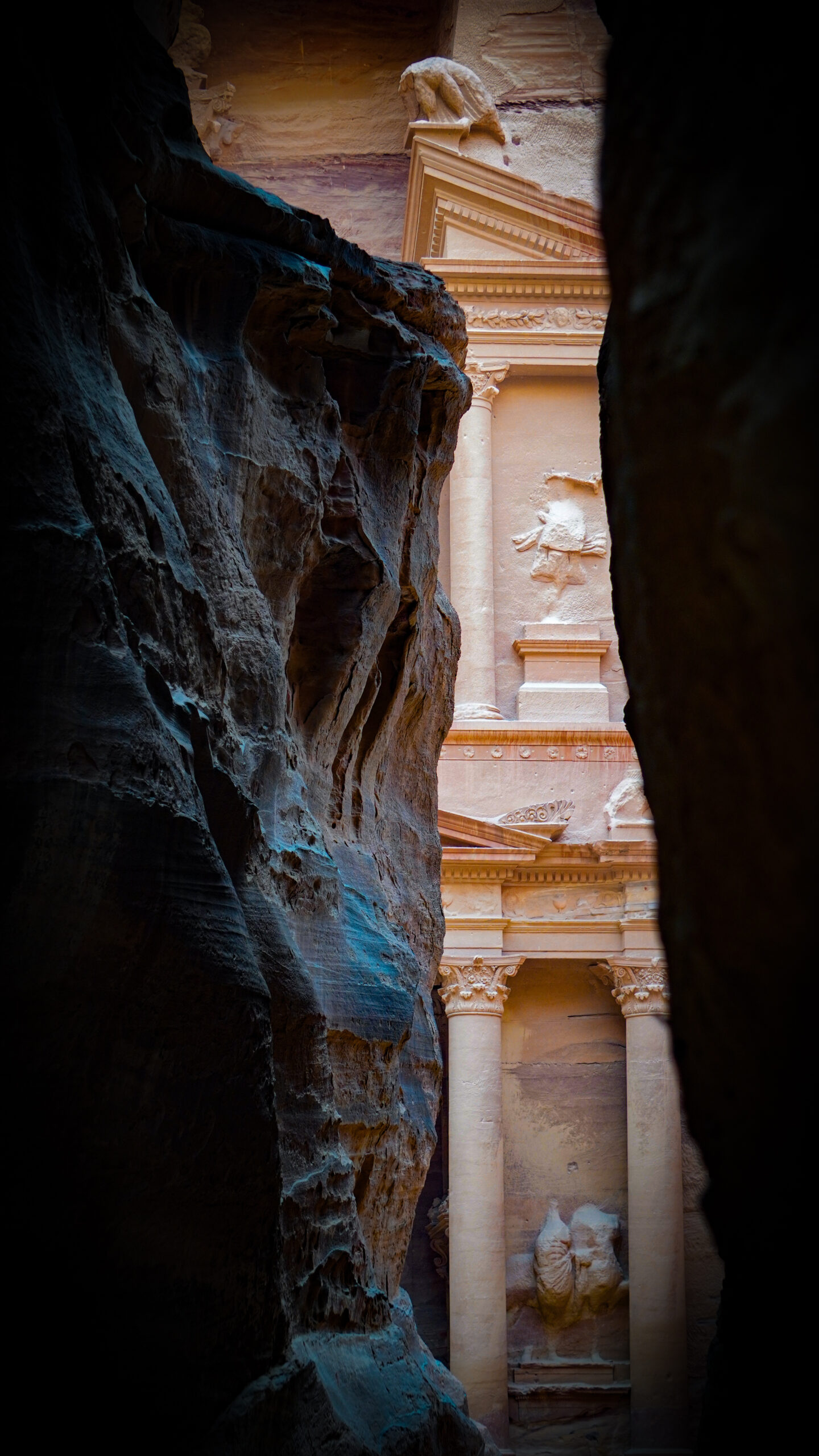 As we turned the corner, the Siq opened up to reveal the magnificent Petra Treasury, also called Al-Khazneh. The intricately carved façade, made from rose-colored rock, left us speechless.