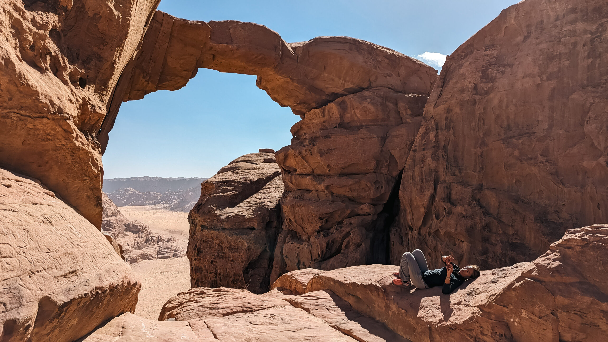 We discovered one of the highest natural rock arch in Wadi Rum, standing at a height of approximately 35 meters. It can be quite intimidating.